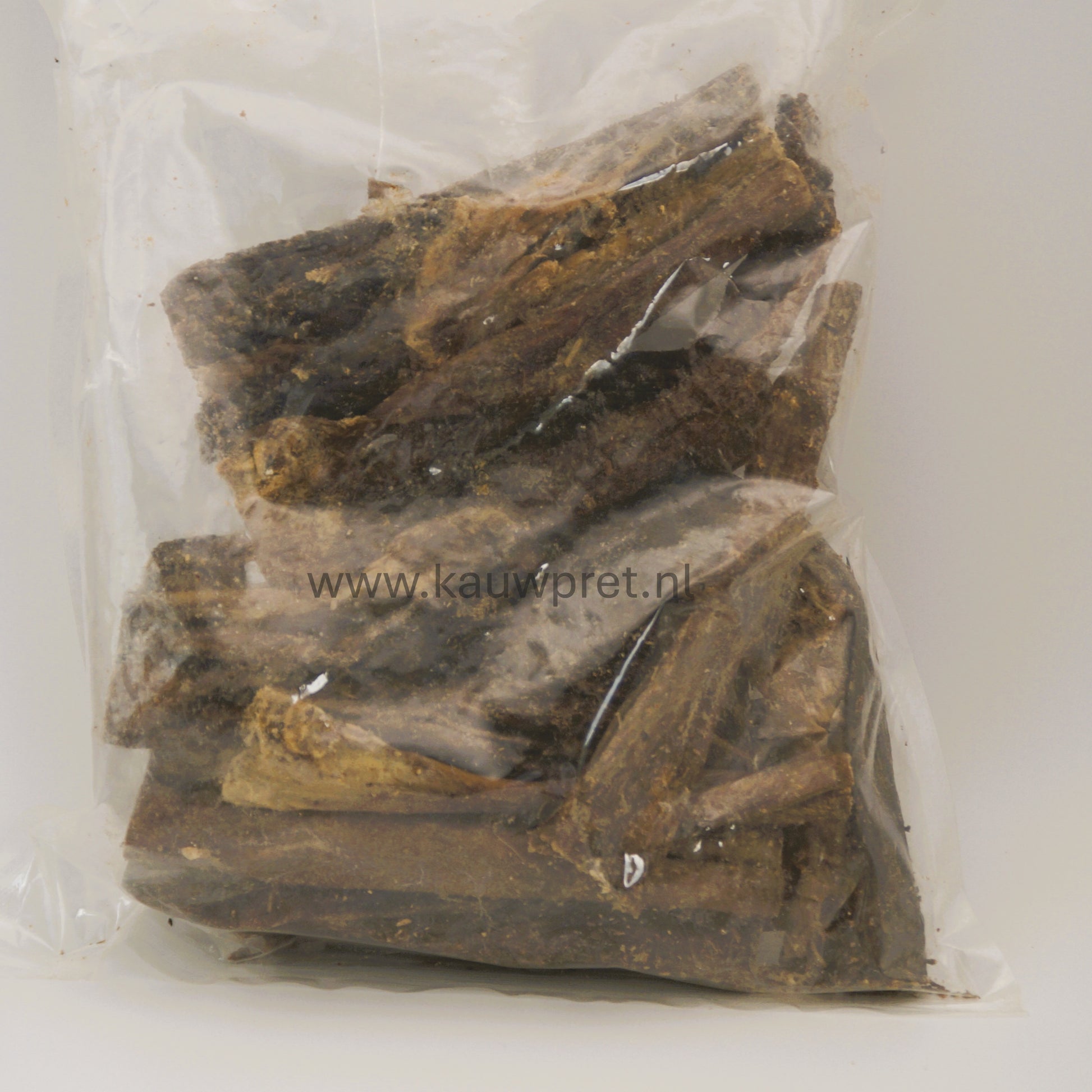 Runderpens heeft een hoge voedingswaarde en zorgt voor een gezonde darmflora bij een hond. Pens is rijk aan vitamines en mineralen zoals ijzer. De taaie structuur werkt als een tandenborstel en komt tegemoet aan de kauw behoefte van je hond. Pens is een 100% natuurlijke hondensnack. De pens is glutenvrij en bevat 1 eiwitbron.